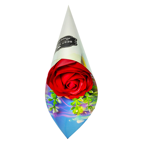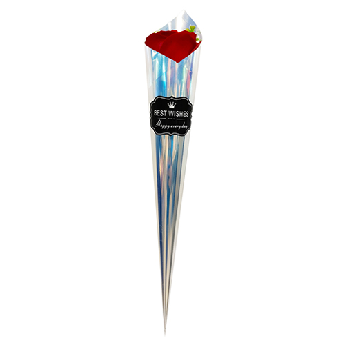 Plastic Rose &Small Flowers w/Stem in Colorful Metallic Traslucent Wrapper w/”Best Wishes” Greeting (Red)